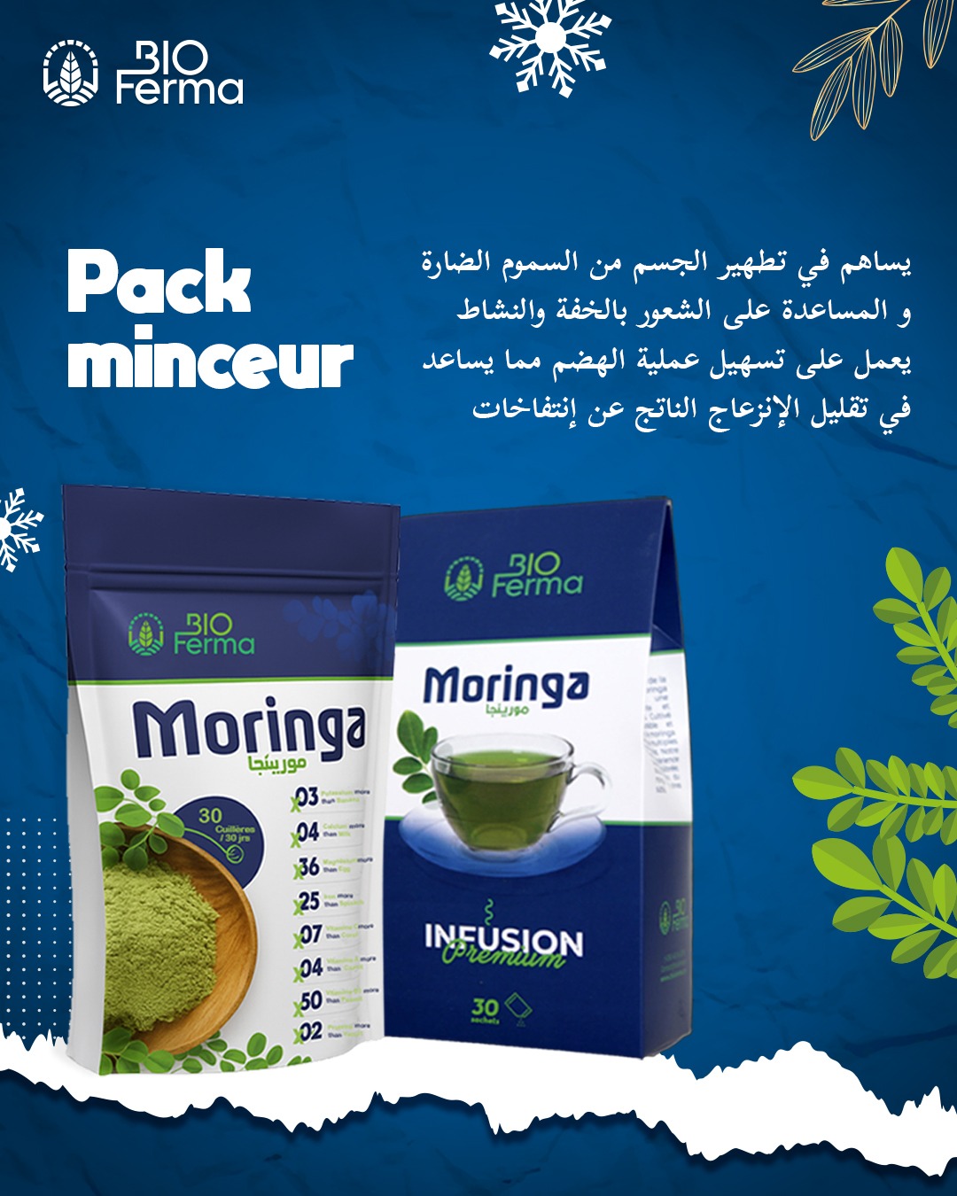 باك التنحيف من Bioferma هو الحل الطبيعي الأمثل لمن يرغبون في دعم فقدان الوزن والاستفادة من الفوائد الرائعة للمورينجا. يحتوي هذا الباك على: